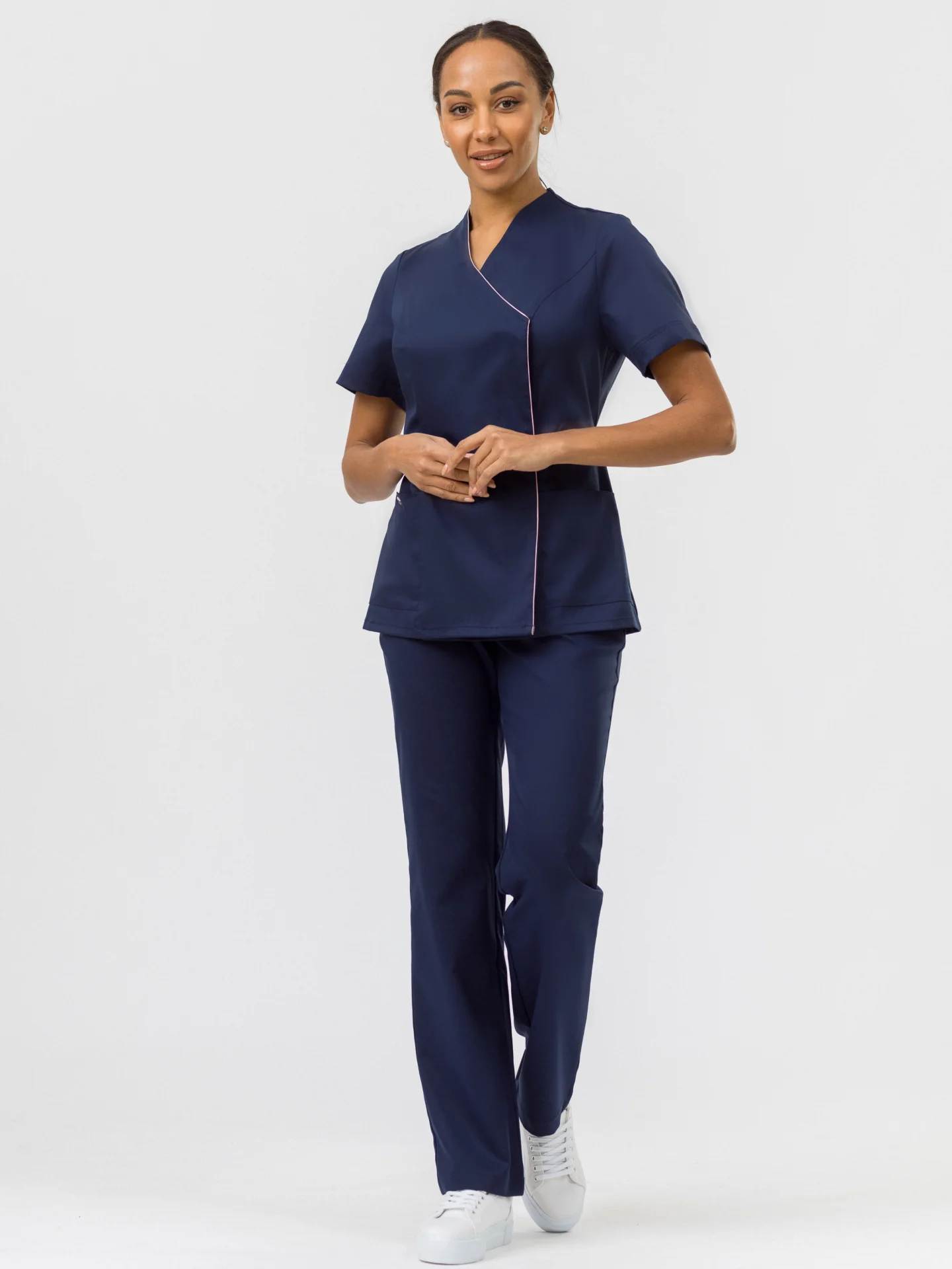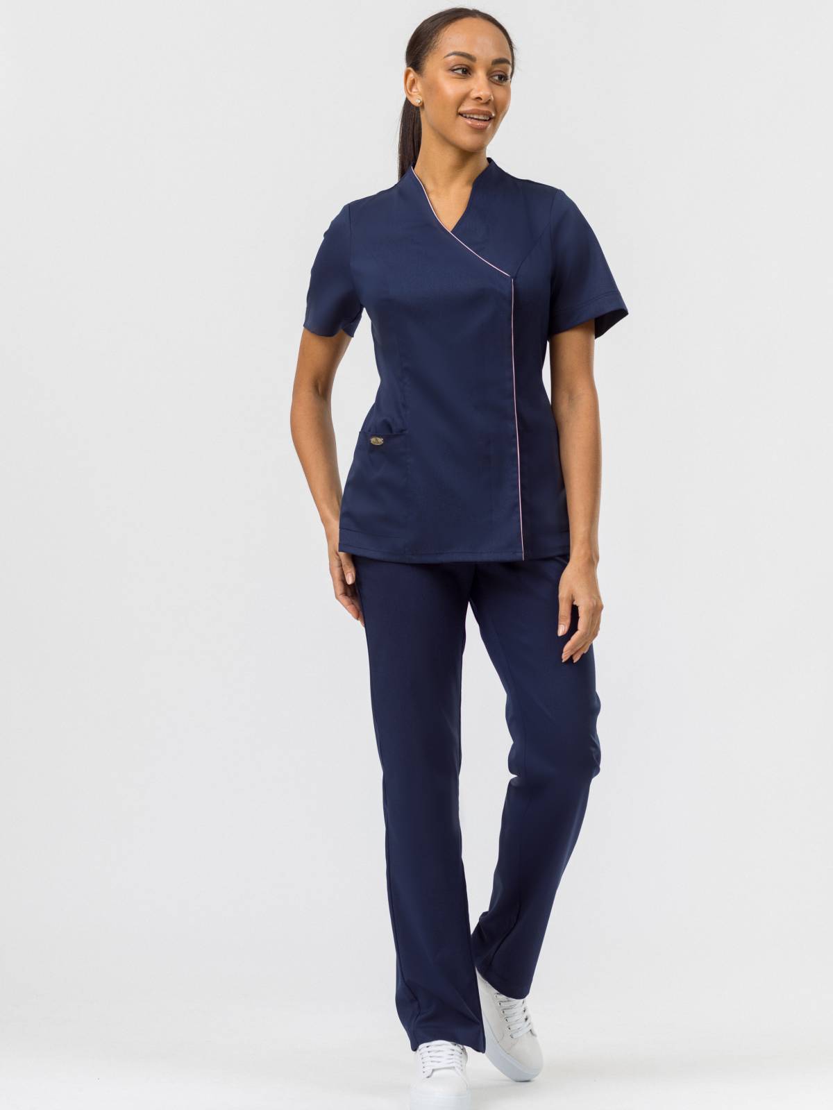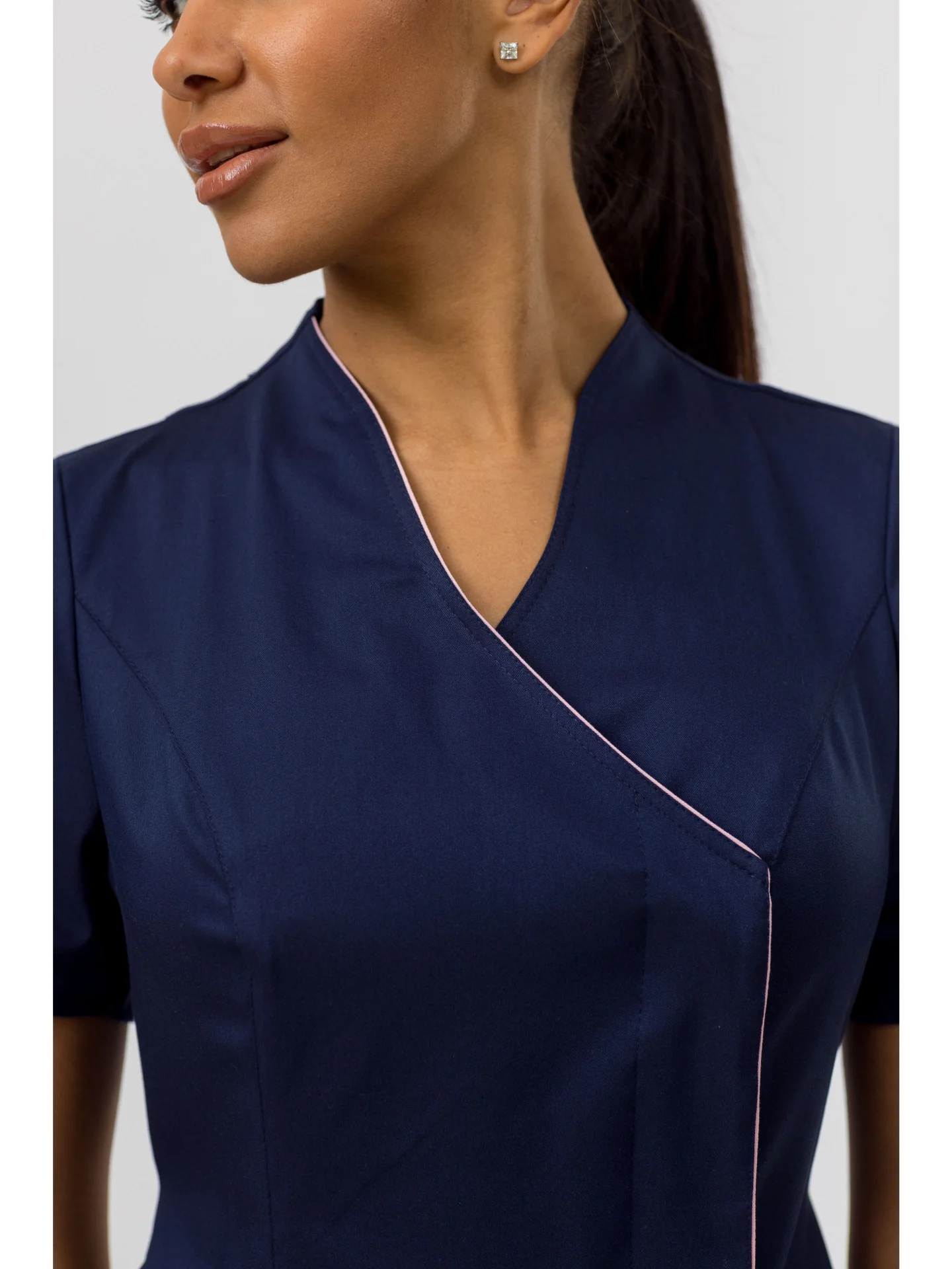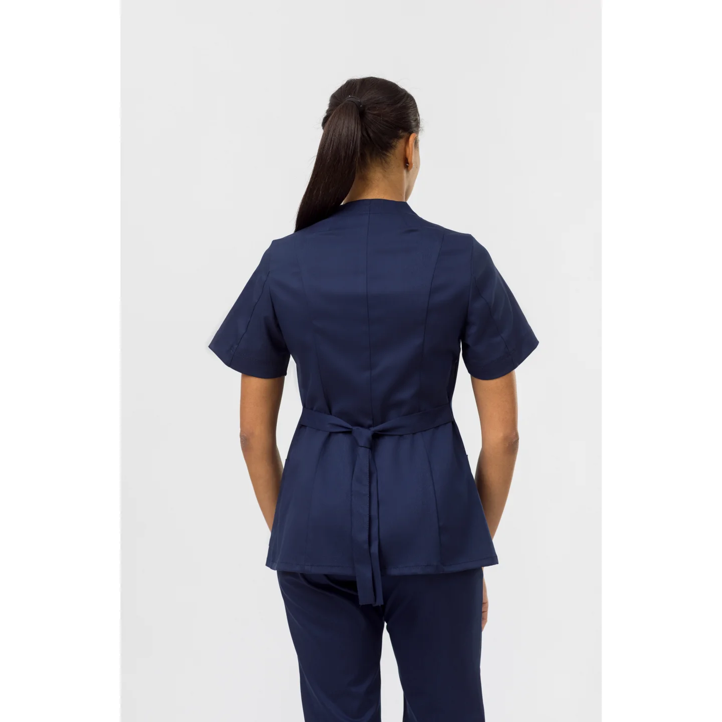 Стильный, элегантный и при этом комфортный медицинский жакет с запахом может стать незаменимой вещью в любом профессиональном гардеробе.Изысканная линия воротника в сочетании с длинным притачным поясом, подчеркивающим талию, делает модель женственной, при этом в меру строгой за счет отсутствия лишних деталей. Плавная и четкая линия плеча, короткий рукав и эстетичная длина изделия до середины бедра украсит любую фигуру.Полуприлегающий силуэт жакета отвечает за свободу движений, боковые вместительные карманы функциональны и удобно расположены, а ткань со стрейчем делает изделие мягким и приятным на ощупь, при этом не подверженным излишним деформациям. Жакет выполнен в черном и белом цветах. В сочетании с классическими медицинскими брюками и обувью составит утонченный деловой образ, не лишенный при этом практичности и комфорта качественной медицинской униформы.