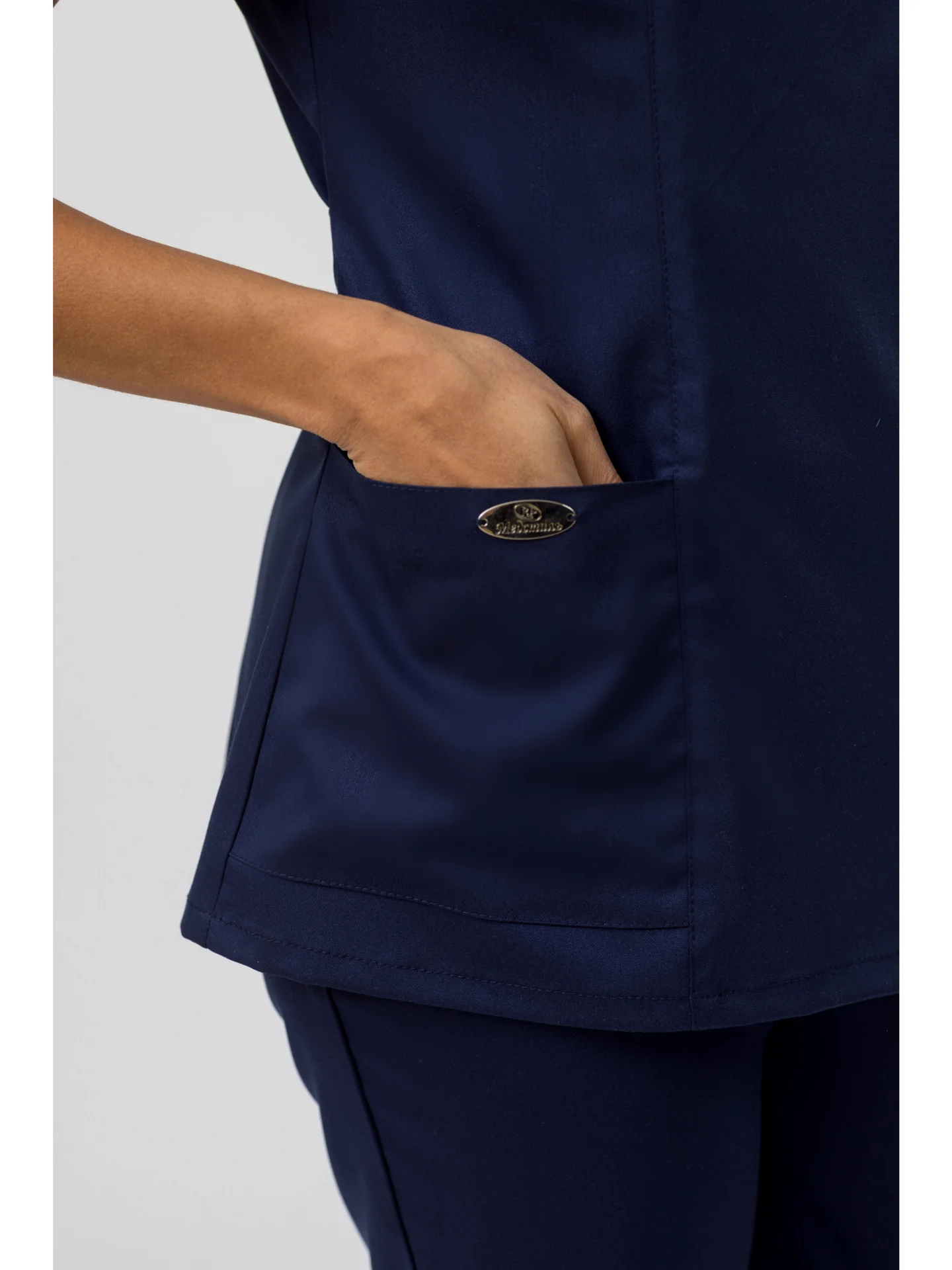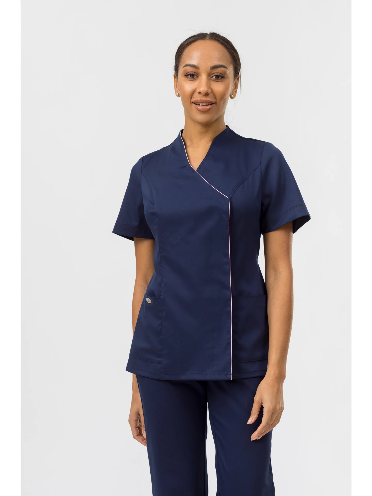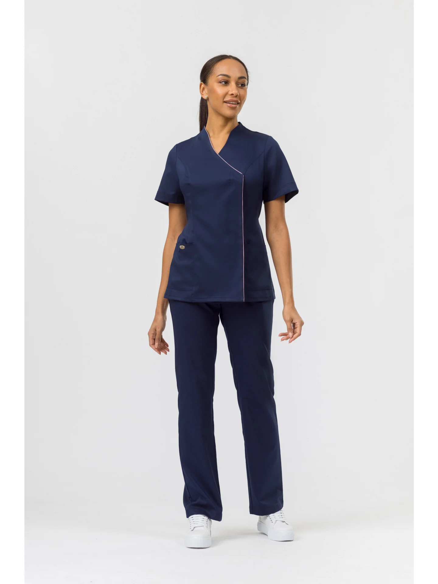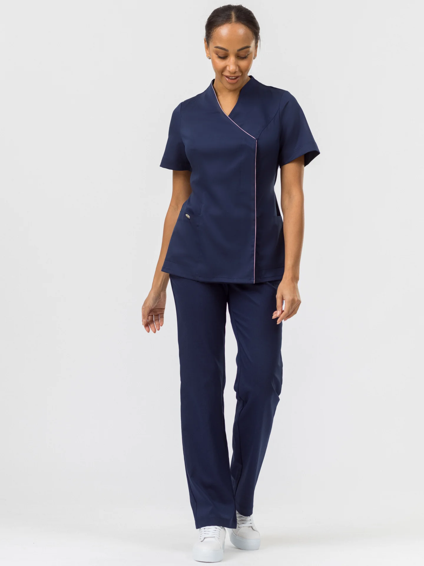 Стильный, элегантный и при этом комфортный медицинский жакет с запахом может стать незаменимой вещью в любом профессиональном гардеробе.Изысканная линия воротника в сочетании с длинным притачным поясом, подчеркивающим талию, делает модель женственной, при этом в меру строгой за счет отсутствия лишних деталей. Плавная и четкая линия плеча, короткий рукав и эстетичная длина изделия до середины бедра украсит любую фигуру.Полуприлегающий силуэт жакета отвечает за свободу движений, боковые вместительные карманы функциональны и удобно расположены, а ткань со стрейчем делает изделие мягким и приятным на ощупь, при этом не подверженным излишним деформациям. Жакет выполнен в черном и белом цветах. В сочетании с классическими медицинскими брюками и обувью составит утонченный деловой образ, не лишенный при этом практичности и комфорта качественной медицинской униформы.